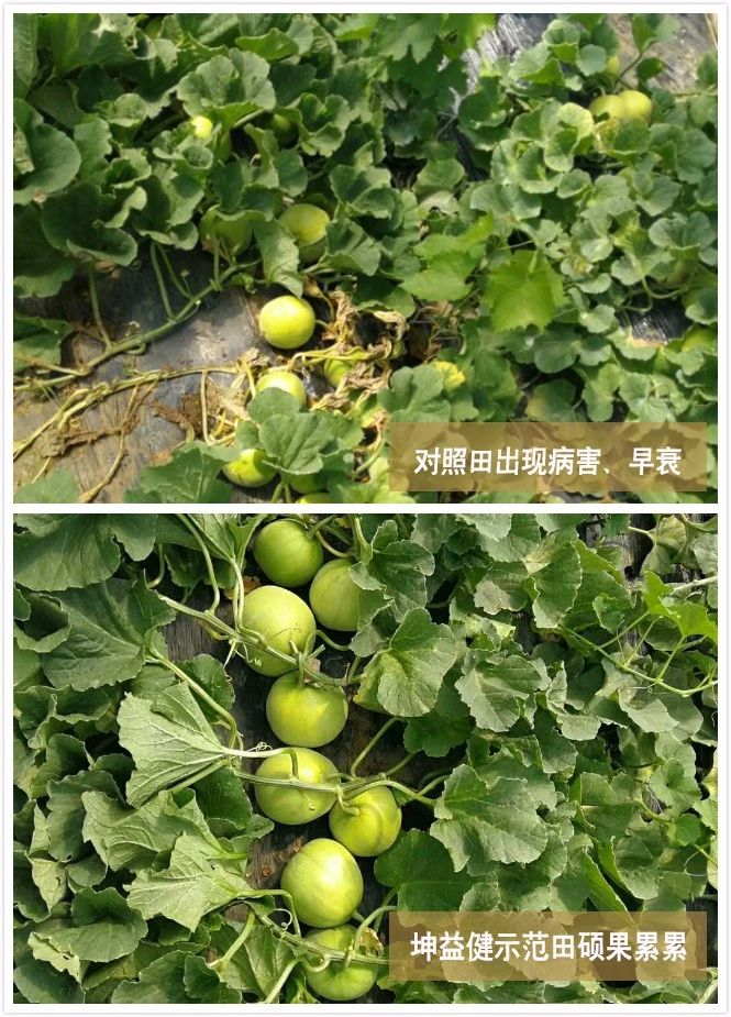 使用效果: 使用坤益健菌劑后,土壤無(wú)板結(jié)硬塊,甜瓜主根粗壯,分布均勻,毛細(xì)根多,PH值由4.5升至5.2,葉片大,濃綠,果型均勻,糖度到13%(產(chǎn)區(qū)內(nèi)“田寶”正常糖度為11-12%),試驗(yàn)設(shè)的對(duì)照棚因大部分早衰死棵,村鄰的還有沒收獲的,病害早衰嚴(yán)重。